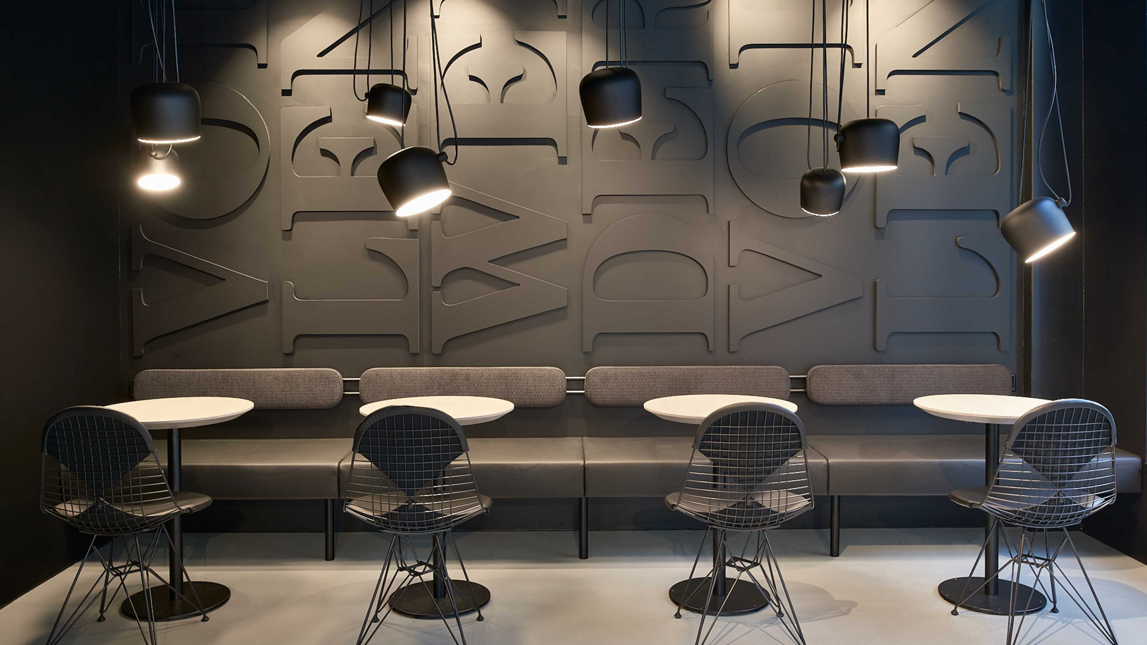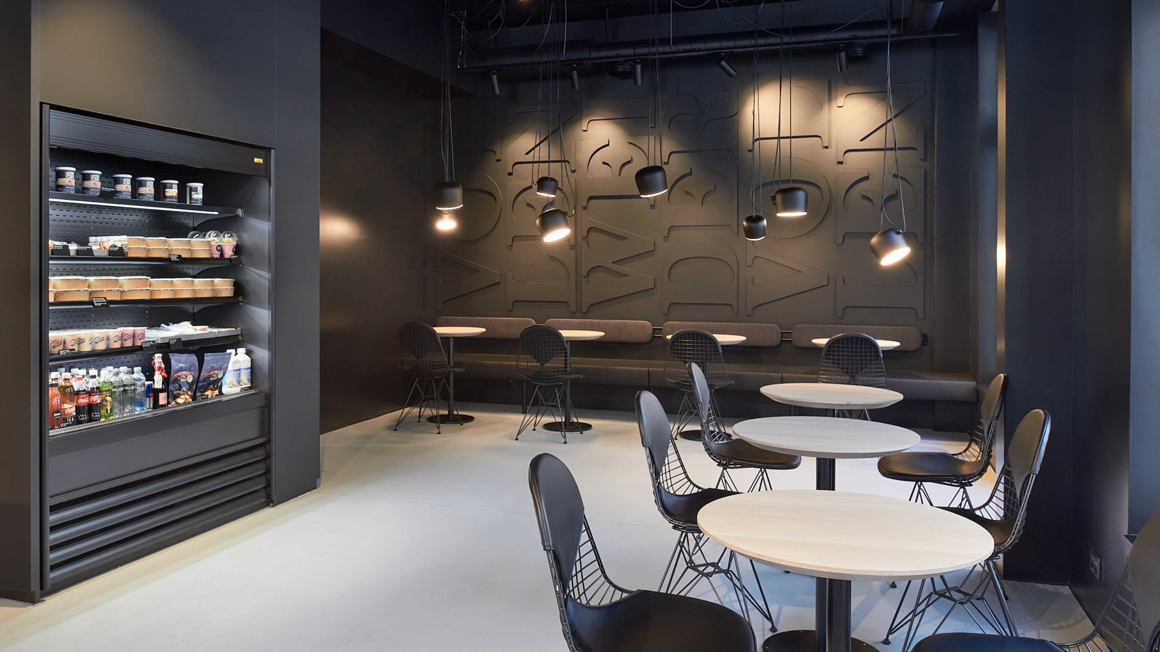 Der Sitzbereich ist minimalistisch, schlicht gehalten; die Stühle und Bänke machen aber in punkto Bequemlichkeit keinerlei Kompromisse und bieten dem Café-Besucher überzeugenden Komfort. Großzügige Fenster lassen ausreichend Tageslicht ins Café – trotz des dunklen Designs wirkt der Raum einladend und freundlich.