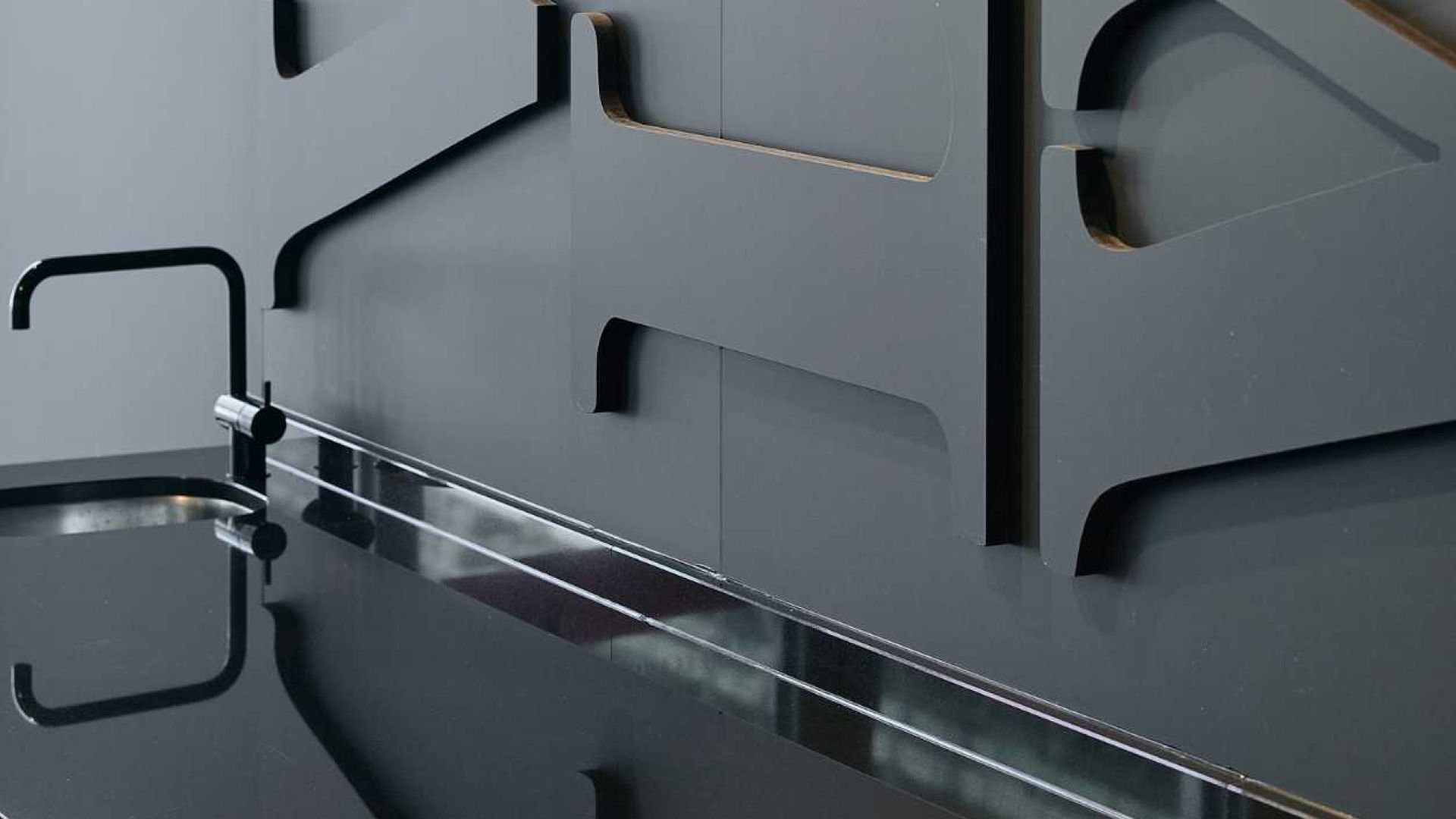 Auffällig und unübersehbar, das Logo des Chocolatiers in schwarzen Reliefbuchstaben an den Wänden. Die Oberfläche korrespondiert mit der Wandverkleidung; die Buchstaben selbst sind aus schwarz gefärbten MDF.