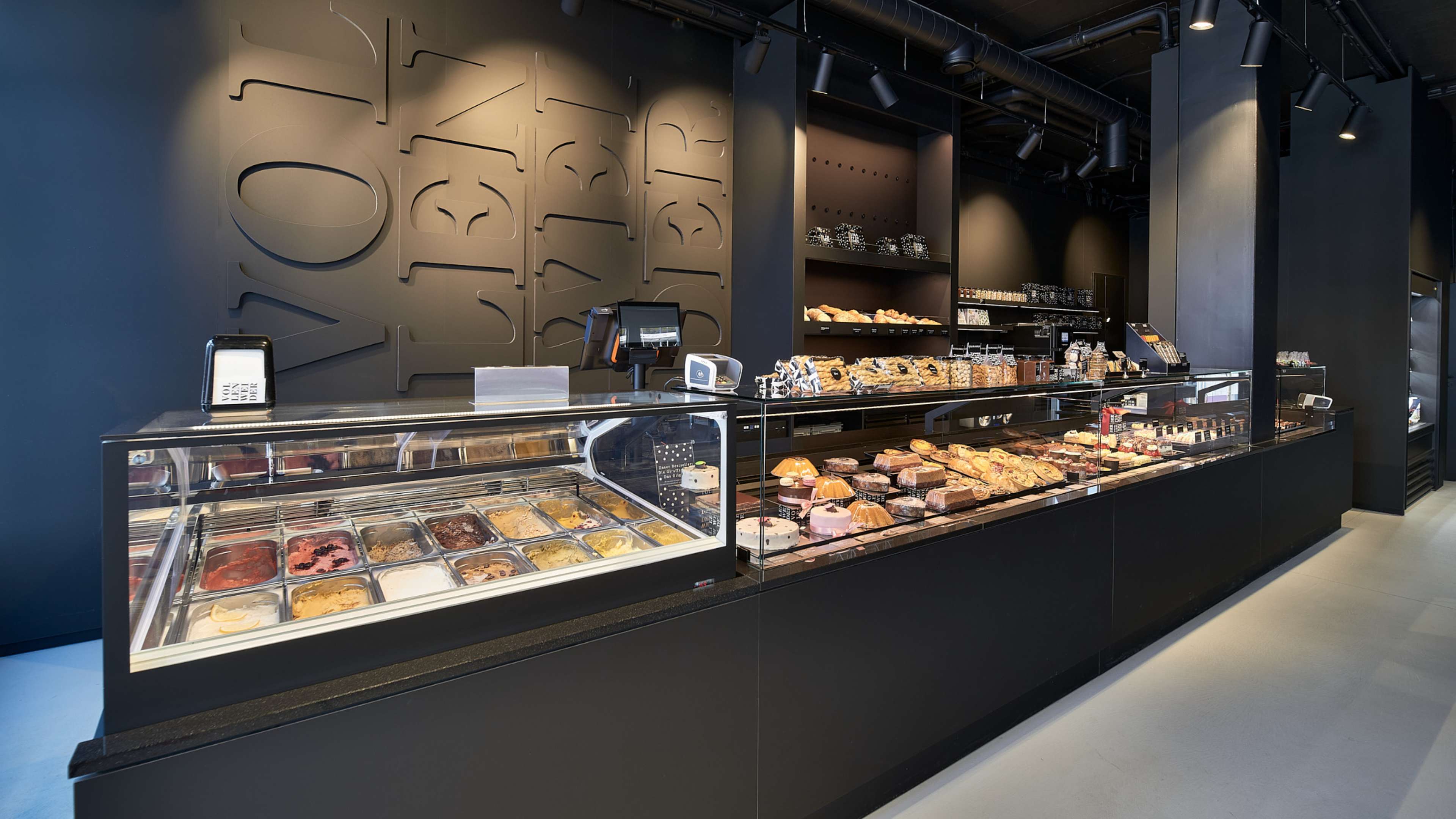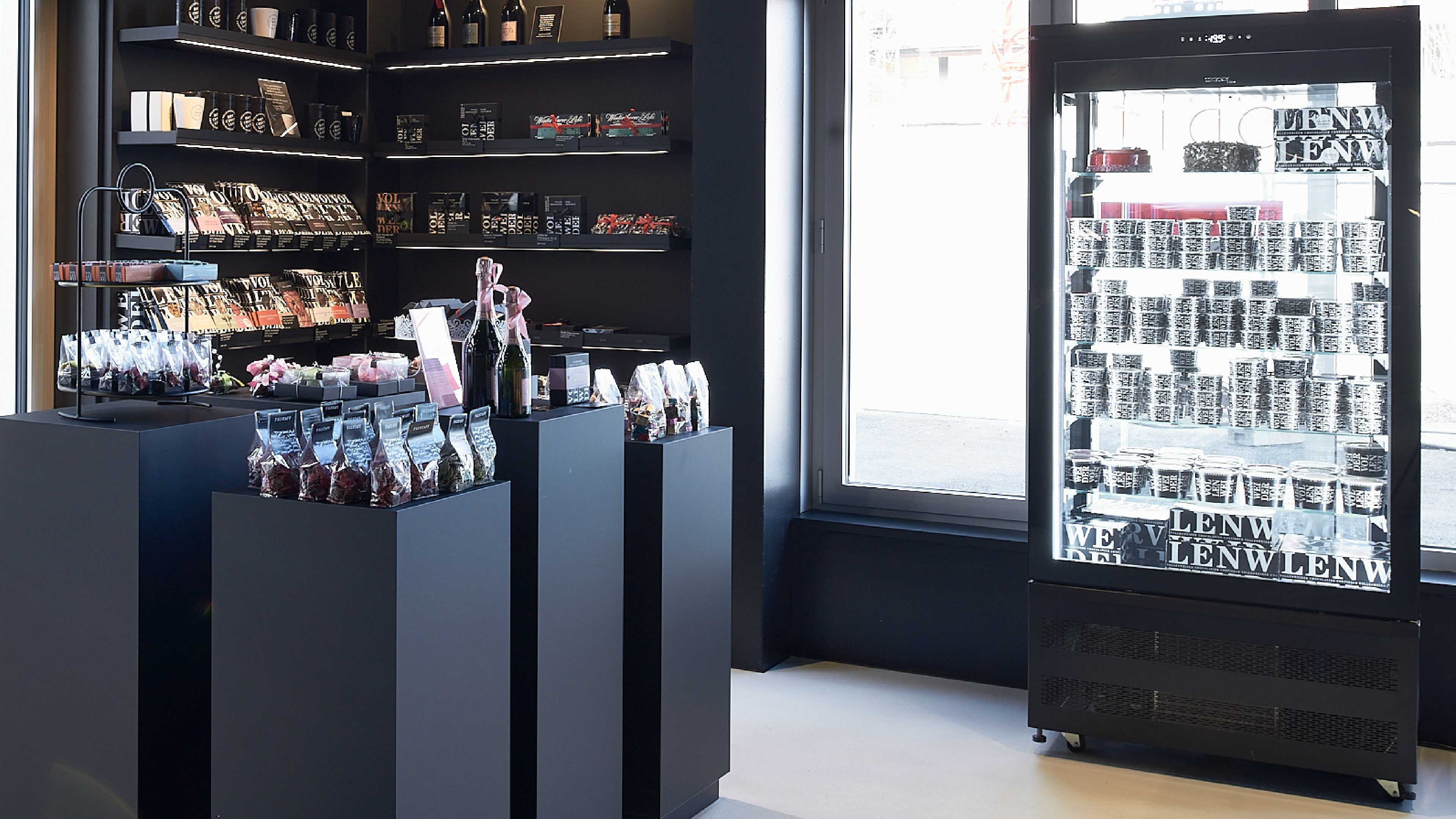 Die Farbe Schwarz ist prägende Komponente des Innendesigns. Die Intention liegt auf der Hand: der Fokus liegt klar auf den exquisiten Produkte von Café Vollenweider Chocolatier Confiseur.