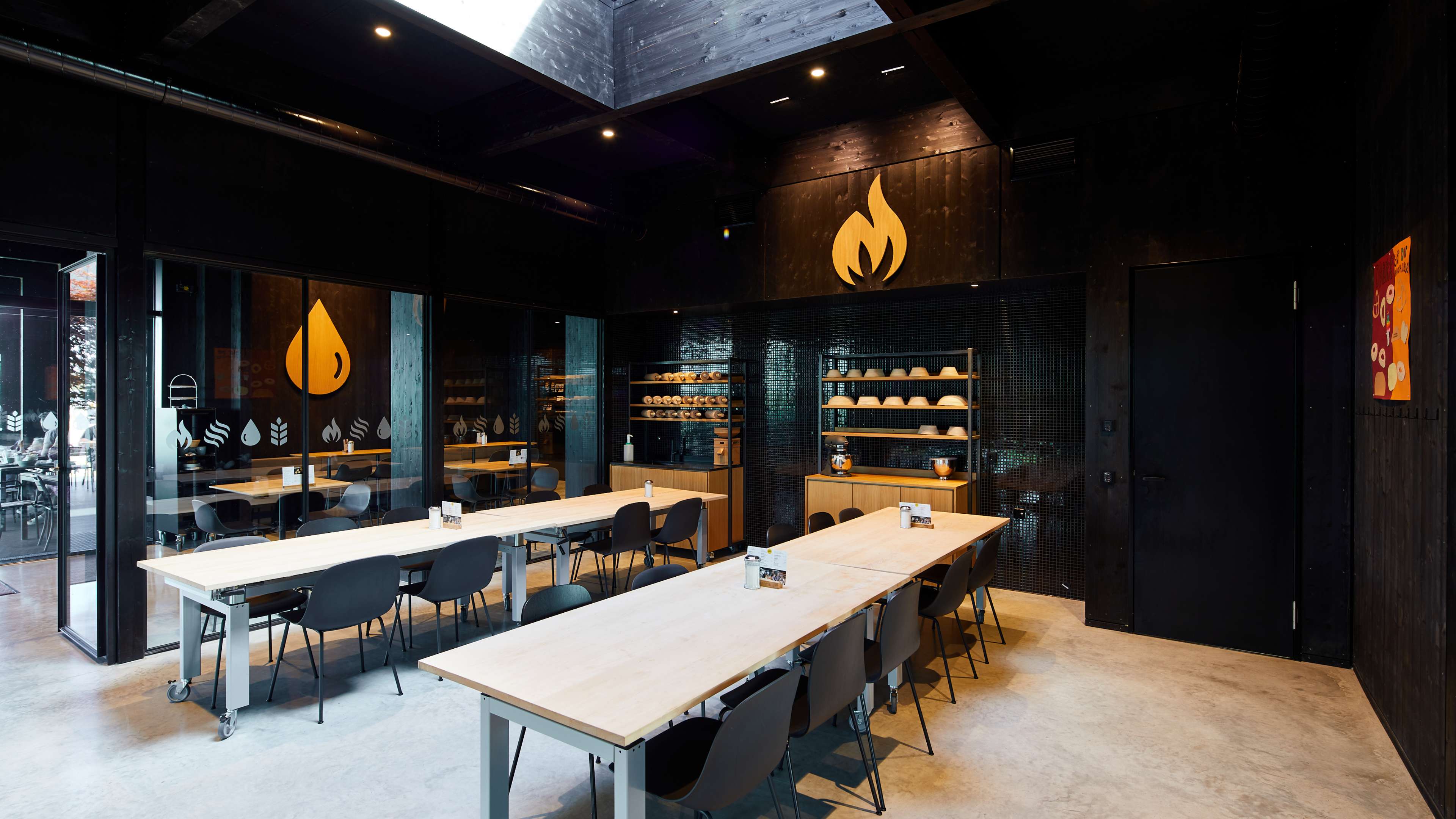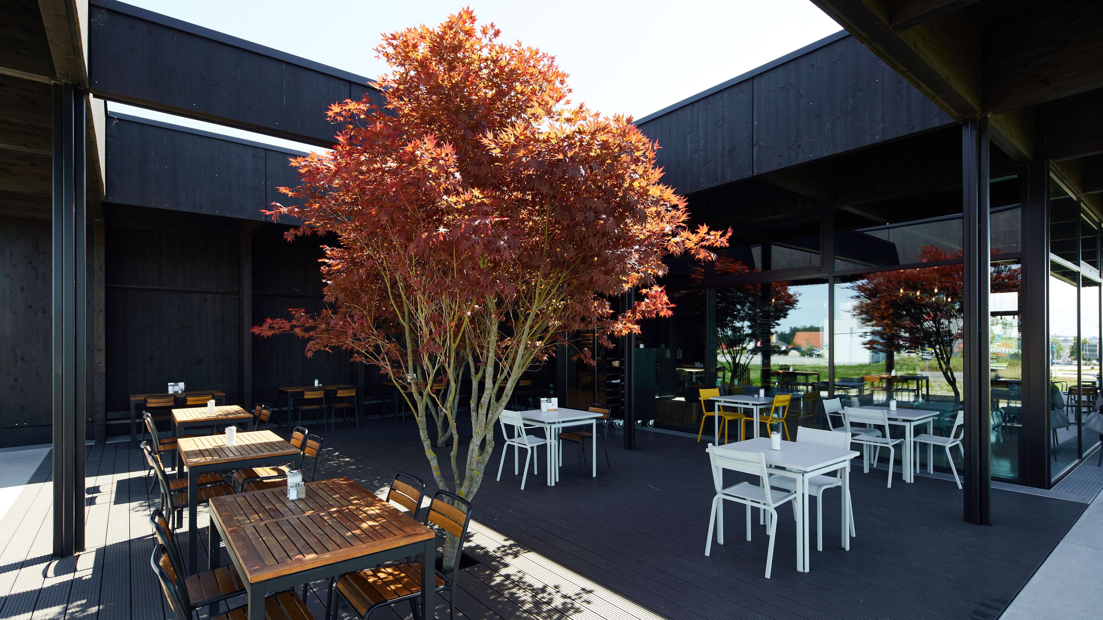 Der schwarze Baukörper aus Holz steht im klaren Kontrast zur umliegenden Natur. Die große Glasfassade mit ihrem uneingeschränkten Blick ins Innere zieht durch ihre Strahlkraft den Besucher magisch an. In allen drei Seiten, von einer Terrasse umgeben und von einem Vordach überdacht, ermöglicht es die volle Nutzung des Außenbereichs. Die große Glasfassade lässt außen und innen miteinander verschmelzen.